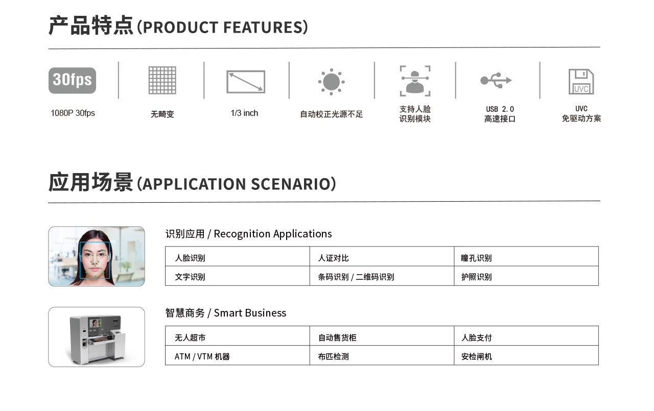 人(rén)臉識别功能(néng),适用(yòng)于各種身(shēn)份驗證和(hé)安全應用(yòng)。支持•1080P分(fēn)辨率以及30fps幀率,提供清晰流暢的(de)視(shì)頻(pín)圖像。采用(yòng)無畸變鏡頭,确保≤圖像質量和(hé)準确度。1/3英寸感光(guāng)元件(jiàn),具有(yǒu)良好(hǎo)的(de)光(guāng)線感應性能(néng)。內(nèi)置自(zìσ)動校(xiào)正功能(néng),能(néng)夠應對(duì)光(guāng)源不(bù)足的(de)情況,确保圖像清晰度。采用(yòng)USB2.0ε接口,方便連接到(dào)各種設備上(shàng)。支持UVC免驅動,即插即用(yòng),無需額外(wài)安裝驅動程序,方便快(kuài)捷。