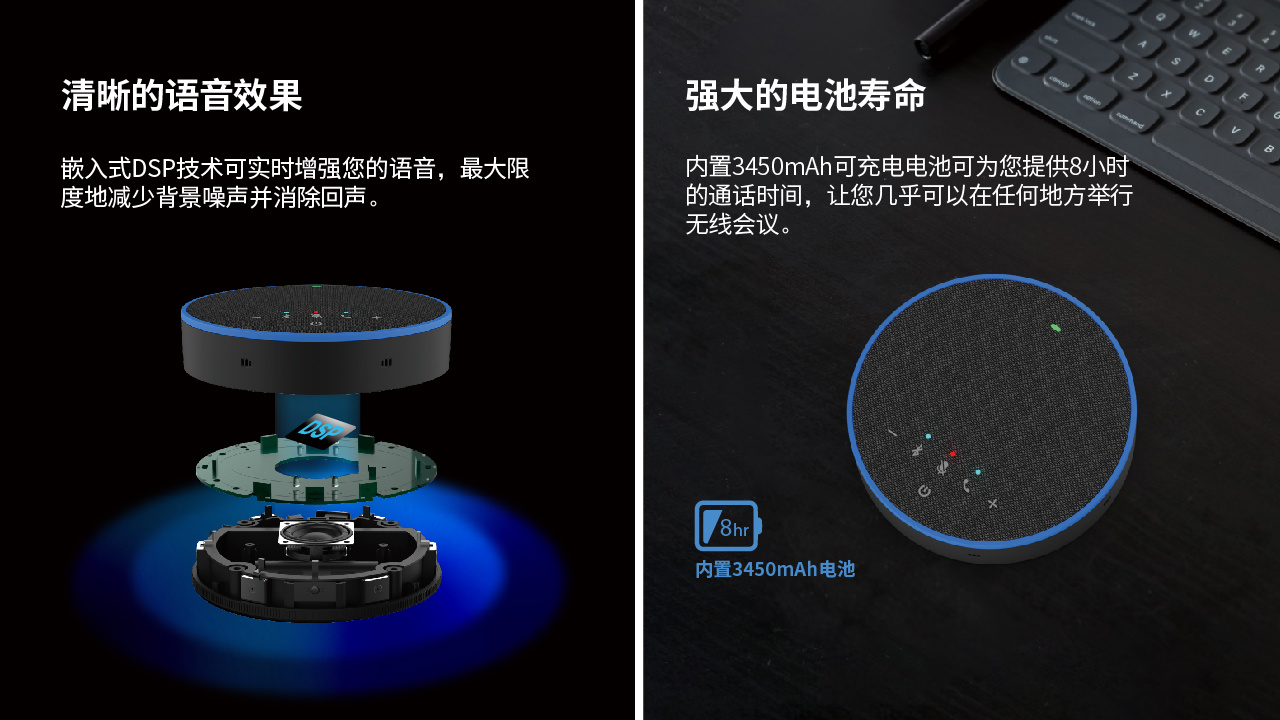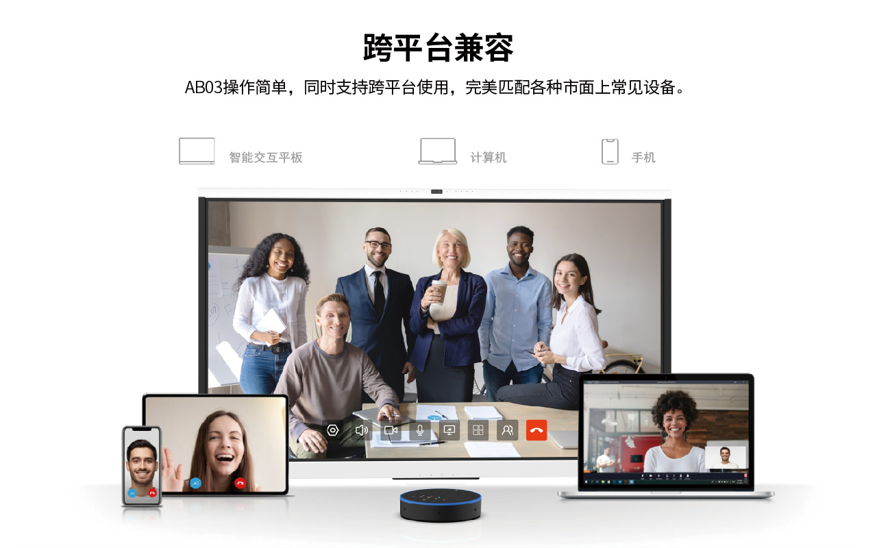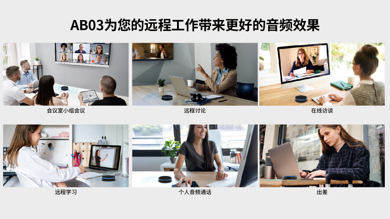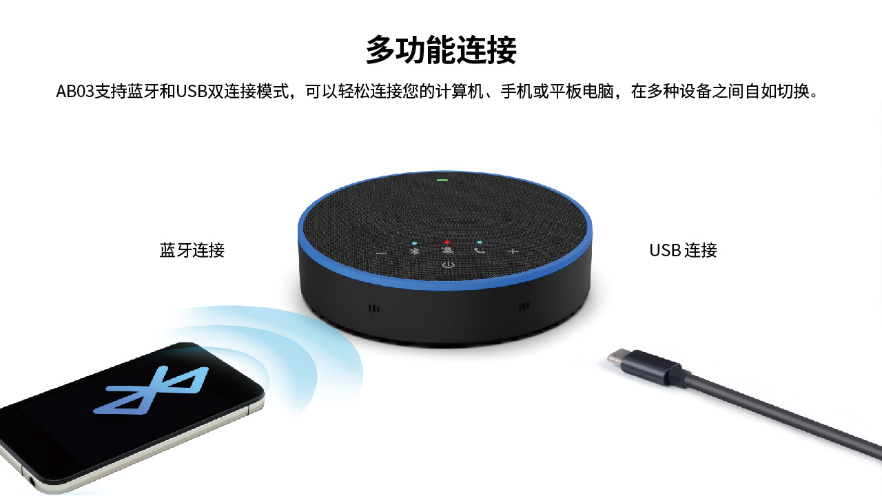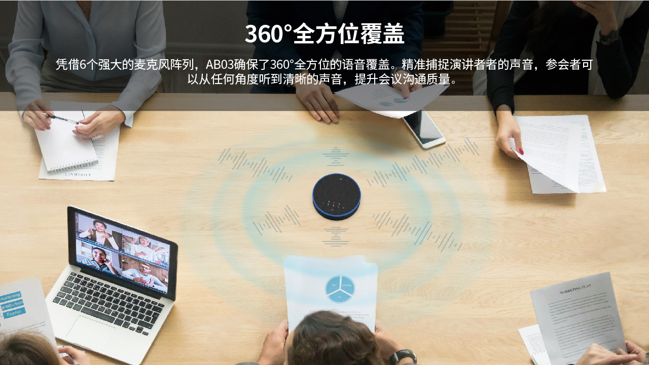AB03是(shì)一(yī)款便攜式會(huì)議(yì)拾音(yīn)器(qì),通(tōng)過藍(lán)牙配對(duì)或USB有(yǒu)©線連接連接到(dào)會(huì)議(yì)室顯示器(qì)、計(jì)算(suàn)機(jī)和(hé)智能(✔néng)手機(jī),即插即用(yòng)。為(wèi)了(le)讓您在辦公室的(de)任何邊緣都(dōu)能(n♠éng)實現(xiàn)無損音(yīn)質傳輸,AB03配備360°全向拾音(yīn)、內(nèi)置6個(gè)麥克風(fēng)陣列 、全雙工(gōng)和(hé)音(yīn)頻(pín)DSP技(jì)術(shù),即使在最大(dà)音(y¶īn)量下(xià)也(yě)不(bù)會(huì)産生(shēng)回聲或失真的(de)聲音(yīn)。為(wèi)了(le)增強您的(de)電(diàn)話(huà)會(huì)議(yì)™體(tǐ)驗,AB03與常用(yòng)的(de)通(tōng)話(huà)軟件(jiàn)完全兼容,讓您可(kě)以将任何地(dì)方變成會(huì)議(yì)室&。