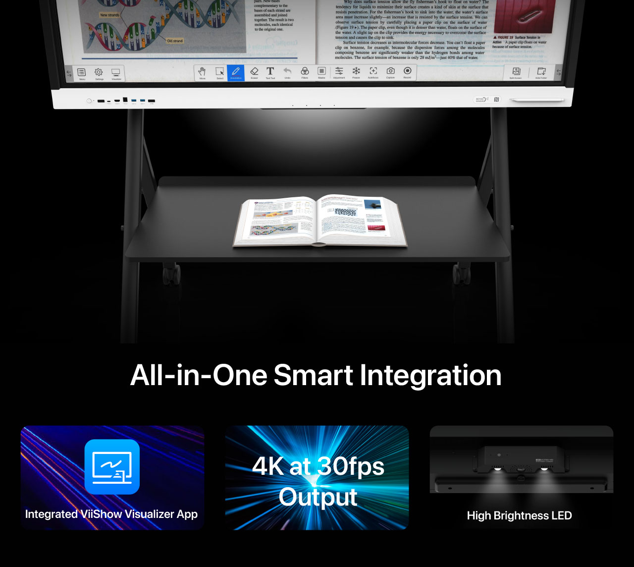 搭載先進的(de)傾斜拍(pāi)攝技(jì)術(shù),實現(xiàn)快(kuài)速掃描與流暢€演示,并配備全域補光(guāng)系統,無論在任何環境下(xià)都(dōu)能(néng)呈現(xiàn)清晰細緻的(de)畫(huà)面,助力打造高(gāo)效互動課堂。