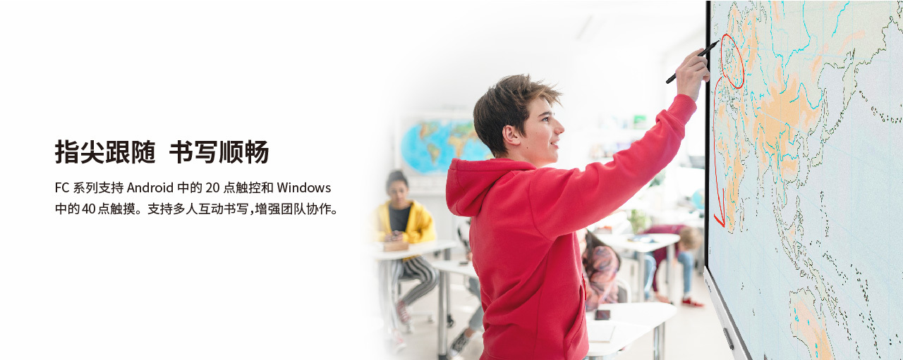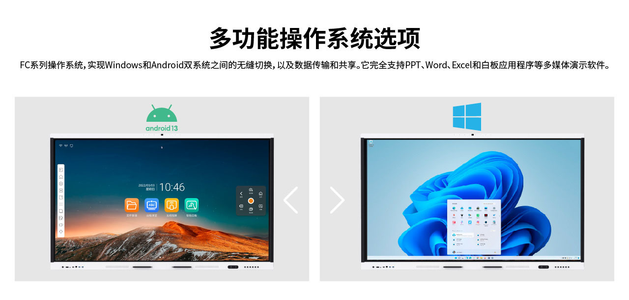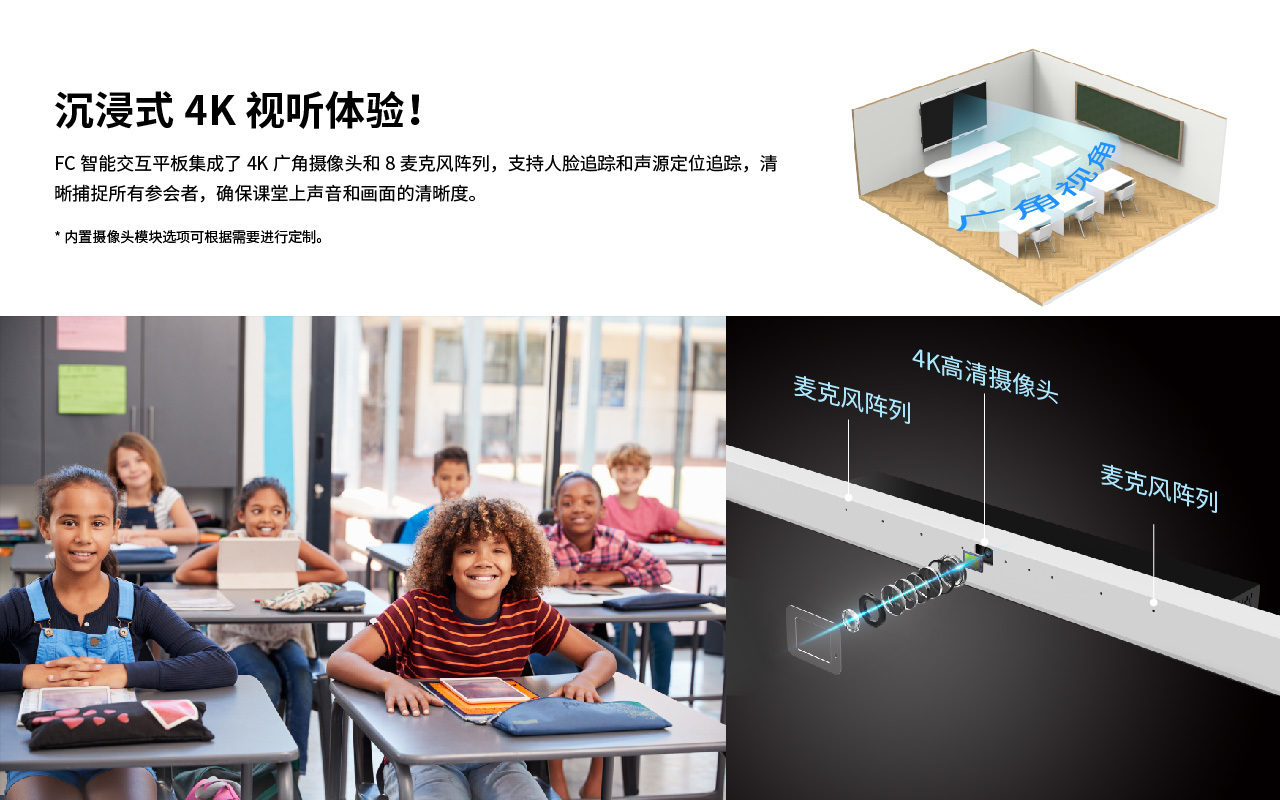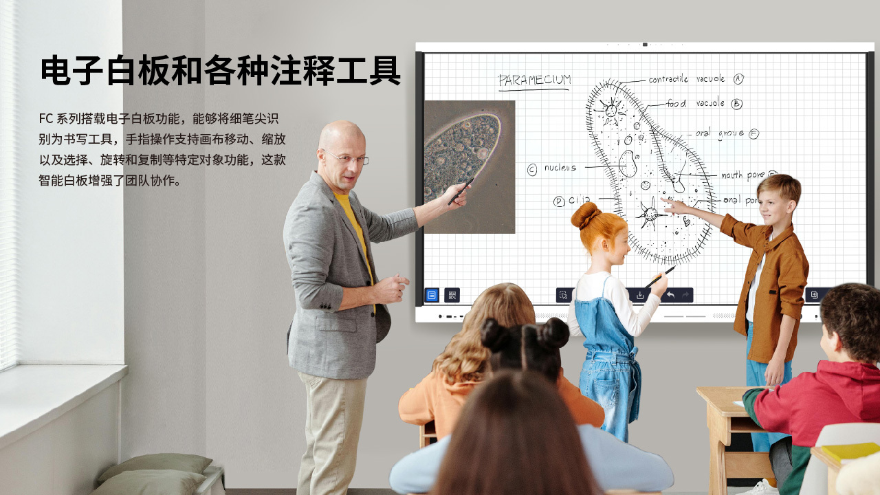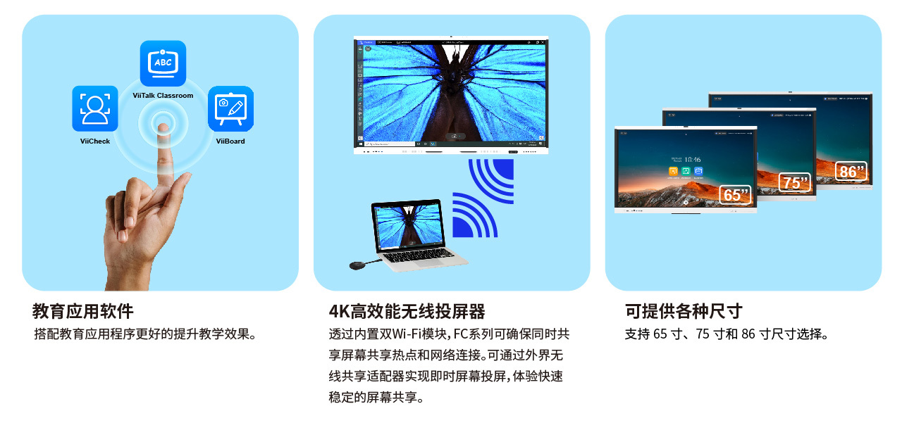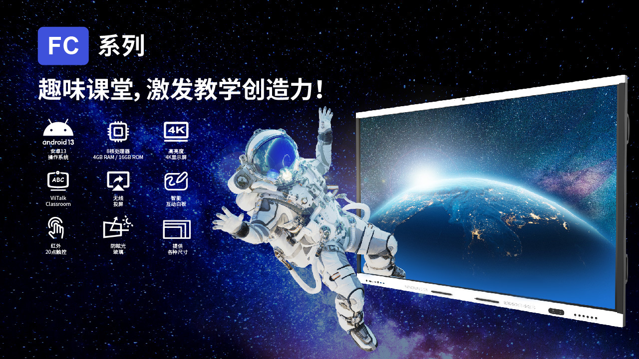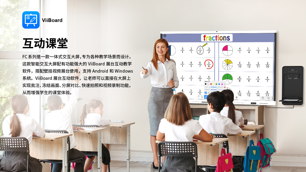 FC系列是(shì)專為(wèi)教育場(chǎng)景設計(jì)的(de)經濟實惠的(de)交互式平闆,适用(yòng)于各種教室環境。它無縫集成了(le)ViiTalk C↓lassroom 4K遠(yuǎn)程課堂系統,支持課堂雲管理(lǐ)平台,并提供便捷的(de)遠(yuǎn)程教學功能(néng)。此外(wài),它可(kě)選擇配備各種無線或壁∞挂式教學展台,搭配專屬的(de)ViiBoard展台軟件(jiàn),促進課堂互動演示,提升教學質量。✔搭載最新的(de)Android 13系統,性能(néng)高(gāo)效穩定。可(kě)供選擇的(de)尺寸包括65、75和(hé)86英寸,同時(shí)提供各種定制(zhì)選項,滿足不(bù$)同教室的(de)需求。