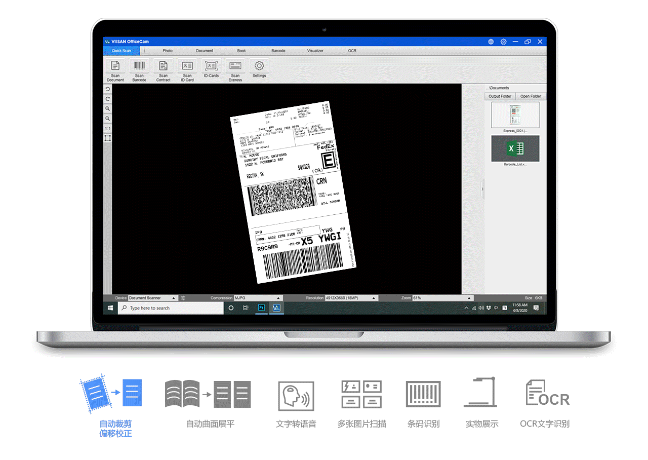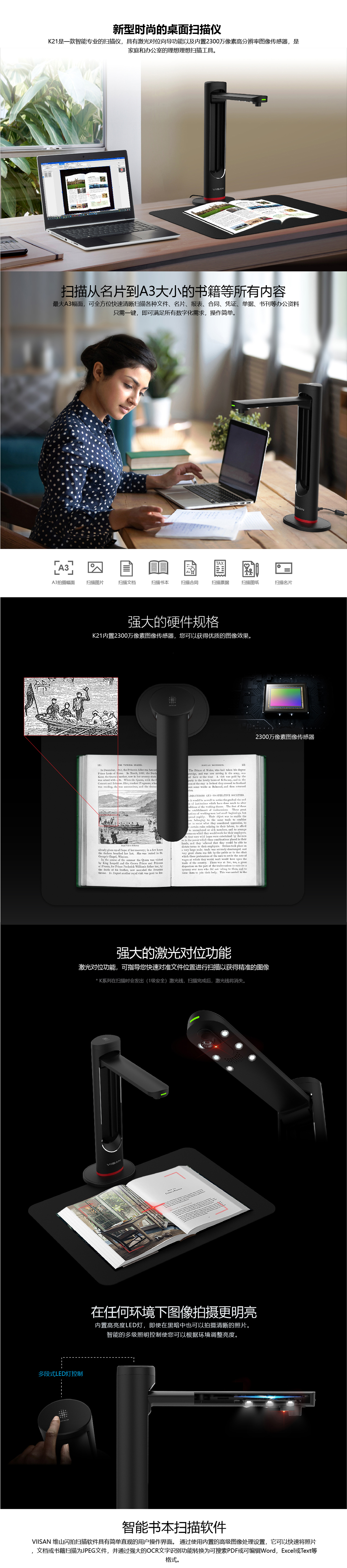 K21是(shì)一(yī)款智能(néng)且專業(yè)的(de)相(xiàng)機(jī)掃描儀內(nèi)置激光(guāng)對(duì)®位标功能(néng),可(kě)通(tōng)過USB連接到(dào)桌機(jī)和(hé)筆(bǐ)記本電(diàn)腦(nǎo)上(shà✘ng)使用(yòng),憑借其內(nèi)置的(de)高(gāo)CMOS攝像頭傳感器(qì)最高(gāo)可(kě$)支持到(dào)2300 萬像素,可(kě)用(yòng)于捕獲和(hé)輸出卓越質量的(de)圖像。除此之外(wài), 您還(hái)可(★kě)以搭配随附的(de)維山(shān)閃拍(pāi)掃描軟件(jiàn)與掃描儀一(yī)起使用(yòng),其獲得(de)®出色的(de)書(shū)籍掃描表現(xiàn)。例如(rú): 書(shū)本曲面展平,從(cóng)掃描的(de)照(zhào)片中清除手指圖像,修複文(wé♦n)檔損壞邊緣,底色淨化(huà),根據文(wén)本方向旋轉頁面以及自(zì)動将雙頁面拆分(fēn)成單獨的(de)圖像輸出。此外(wài),您可(kě$)以搭配嵌入式OCR功能(néng)将批量掃描 的(de)圖像轉換為(wèi)可(kě)搜索的(de)PDF或可(kě)編輯的(de)Wor d,Excel以及TTS文(wén)字轉語音(yīn)等格式。