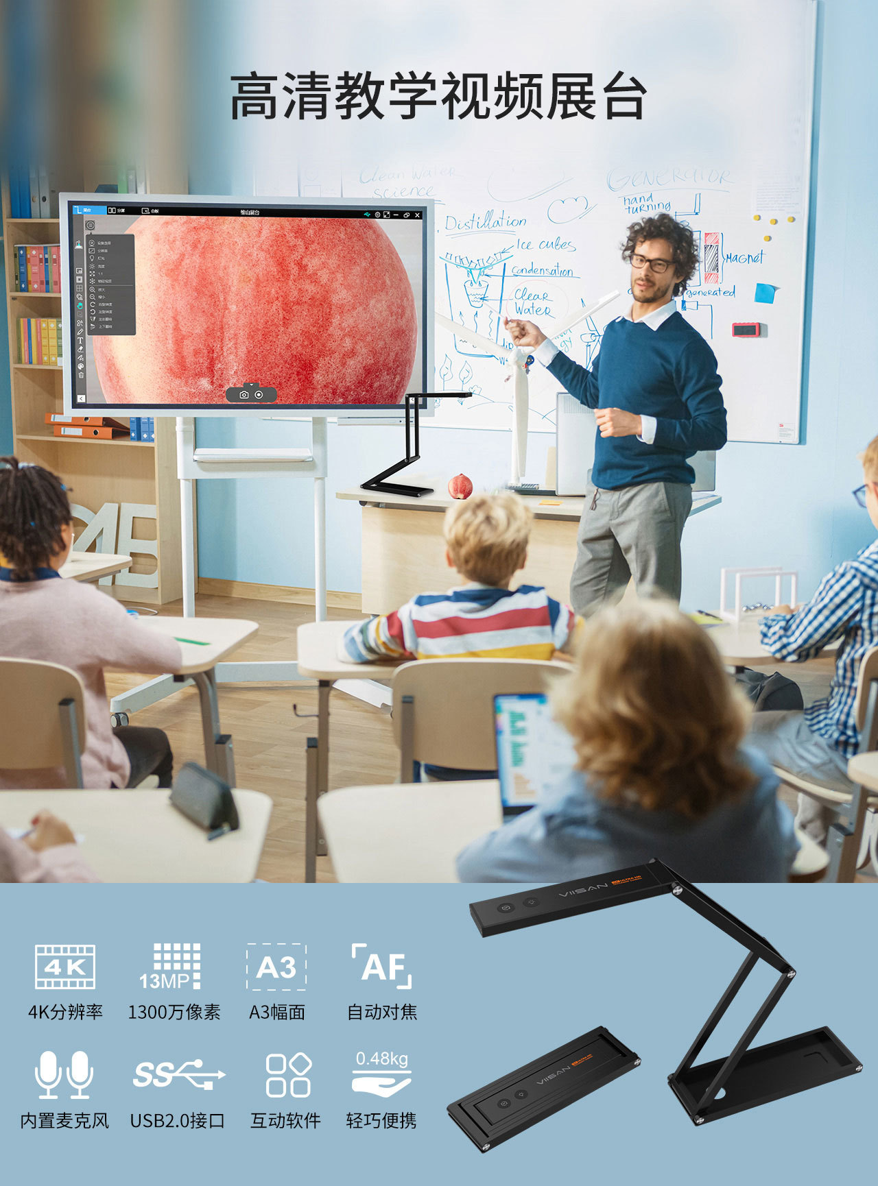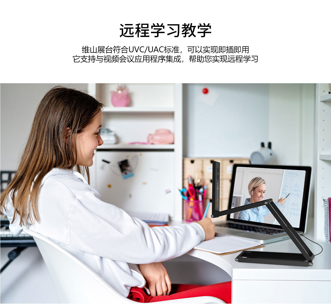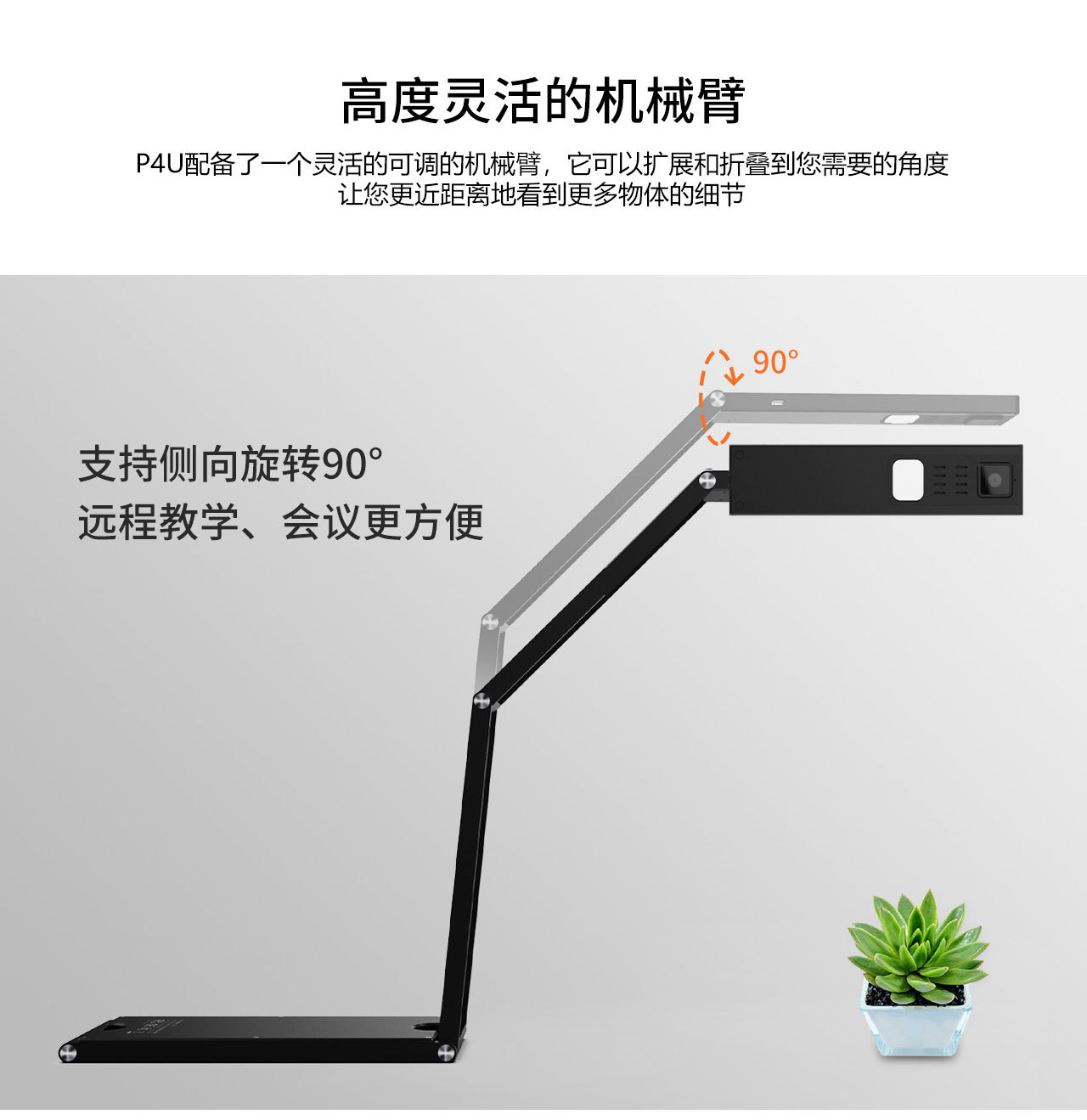 P4U可(kě)以幫助教師(shī)展示每一(yī)個(gè)細節,無論是(shì)演示頁面、一(yī)本書(shū),或顯示一(yī)個(gè)标本的(de)模型。 您的(de)學生(shēngβ)無論在課堂上(shàng)還(hái)是(shì)遠(yuǎn)程都(dōu)能(néng)看(kàn)到(dào)清↓晰的(de)圖像。可(kě)折疊機(jī)械臂可(kě)以輕松折疊産品并存放(fàng)在您攜帶的(de)包裡(lǐ),非常方便老(lǎo)師(sh→ī)随身(shēn)攜帶設備,随時(shí)随地(dì)進行(xíng)教學、錄音(yīn)、 直播或課程規劃。→