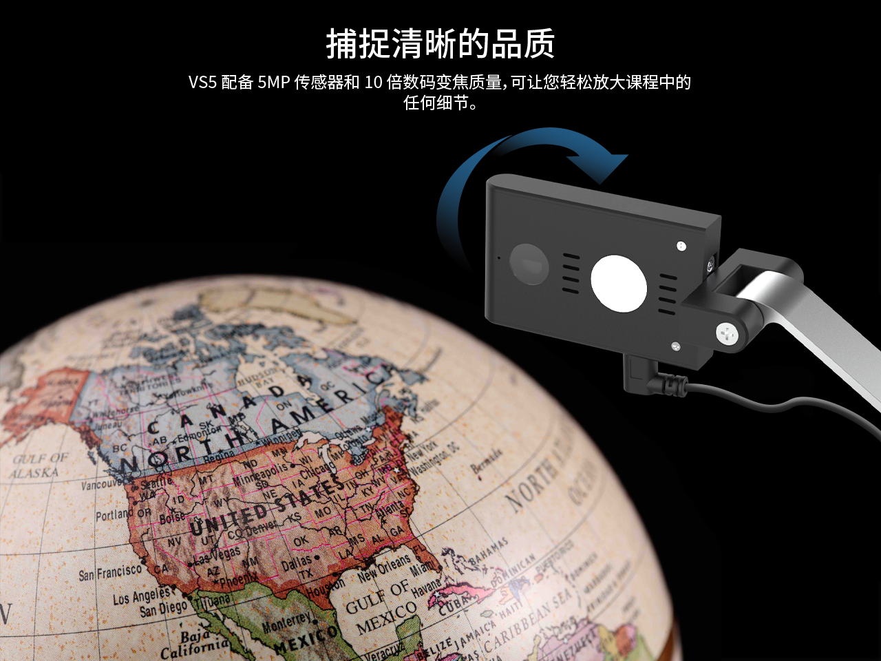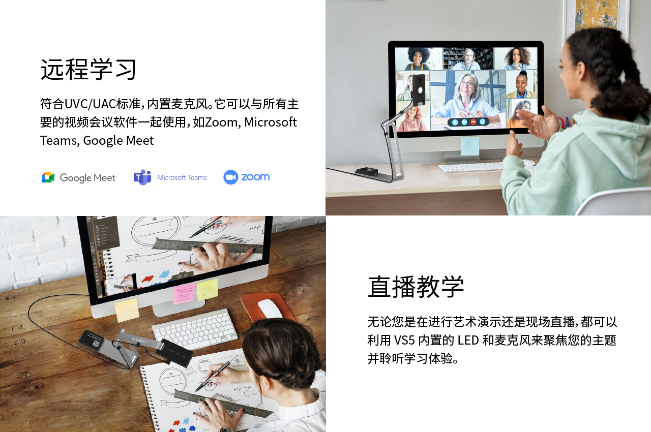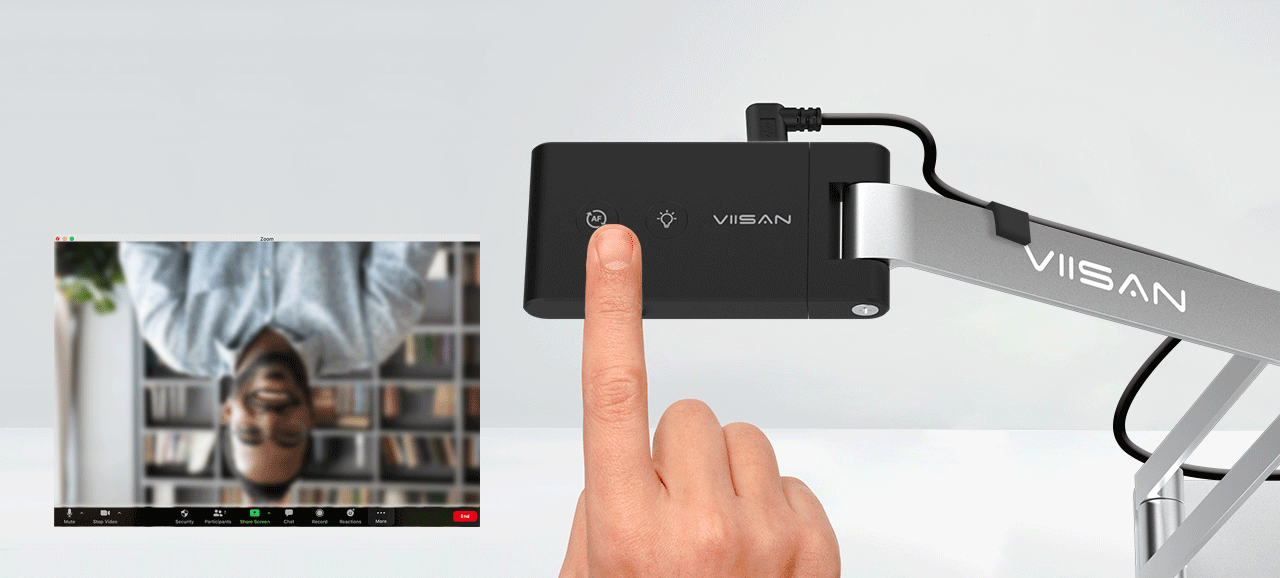 VS5 适用(yòng)于課堂教學和(hé)視(shì)頻(pín)會(huì)議(yì)。隻需單擊一(yī)個(gè)按鈕,即可(kě)翻轉實時(shí)圖像,并根據需要(yào)對(duì)焦您的(de)臉部、課本以及任何物(wù)體(tǐ)。