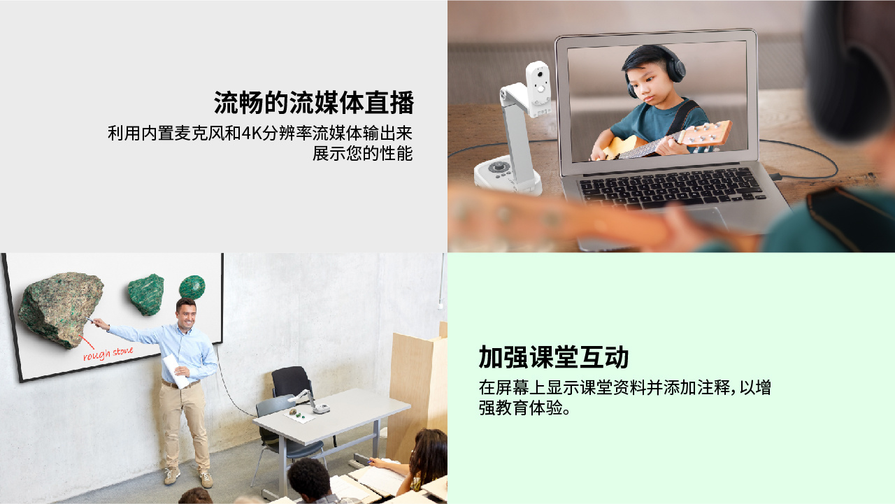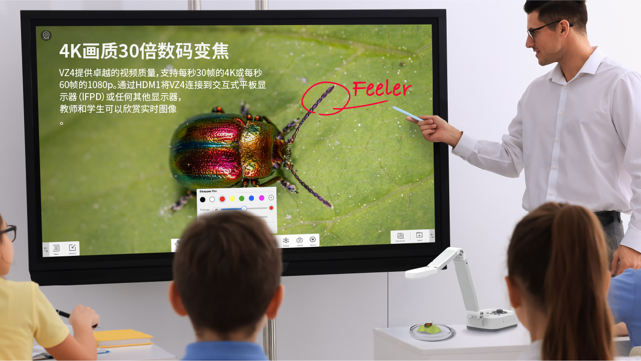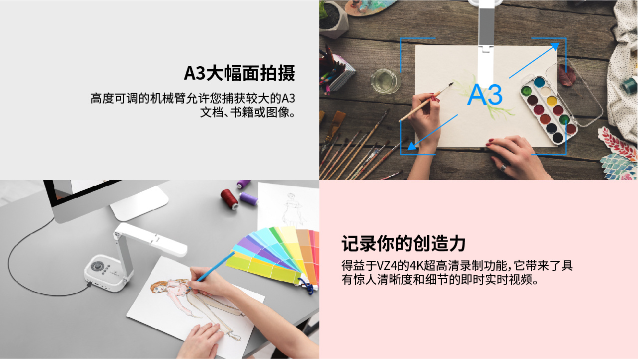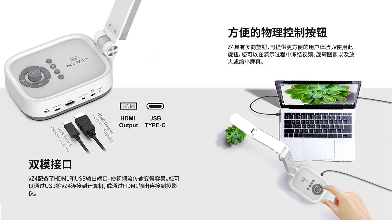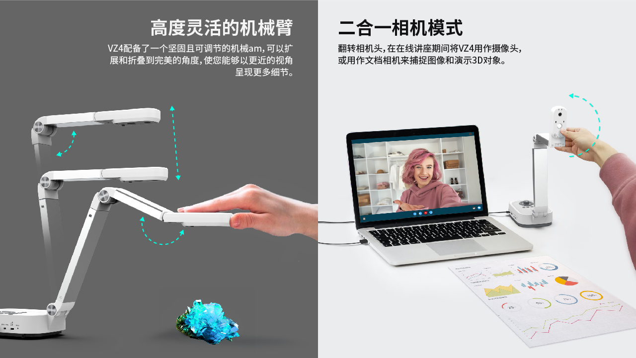 VZ4是(shì)一(yī)款二合一(yī)的(de)解決方案可(kě)視(shì)化(huà)工(gōng)具(文(wén)檔相(xiàng )機(jī)),具有(yǒu)1600萬像素分(fēn)辨率、每秒(miǎo)30幀的(de)4K流媒體(tǐ)和(≥hé)16倍數(shù)字變焦功能(néng)。它可(kě)以讓你(nǐ)在展示書(shū)籍或展示任何材料時(shí)捕捉每一(yī)個(gè)細節,而不(bù)會(huì)遺漏任何東(dō®ng)西(xī)。你(nǐ)的(de)學生(shēng)無論在課堂上(shàng)還(hái)是(shì)在遠(yuǎn)處都(dōu)能(néng)看(kàn)到(dào)清晰的(de✘)圖像。易于操作(zuò)的(de)控制(zhì)面闆還(hái)提高(gāo)了(le)教學效率。可(kě)折疊₹的(de)機(jī)械臂可(kě)以牢固地(dì)折疊成整潔的(de)機(jī)身(shēn)并存放(fàng)在袋子(zǐ)中,方便您将設備攜帶到(dào)任何地(dì)方進行(xíng)教學、錄制(zhì)、直播或課程規劃。