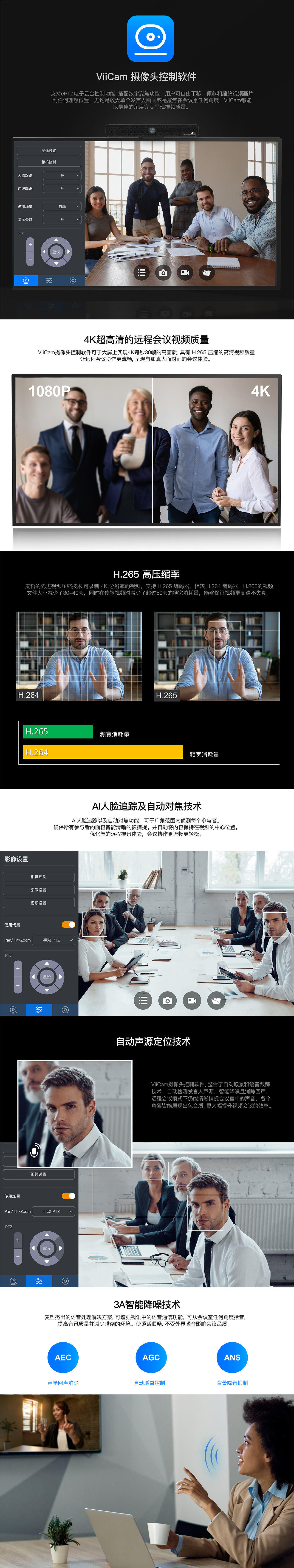 4K超高(gāo)清視(shì)頻(pín)質量 支援H.265視(shì)頻(pín)壓縮 ePTZ智能(néng)人(rén)臉跟♦蹤 自(zì)動聲音(yīn)定位偵測 3A智能(néng)降噪技(jì)術(shù)