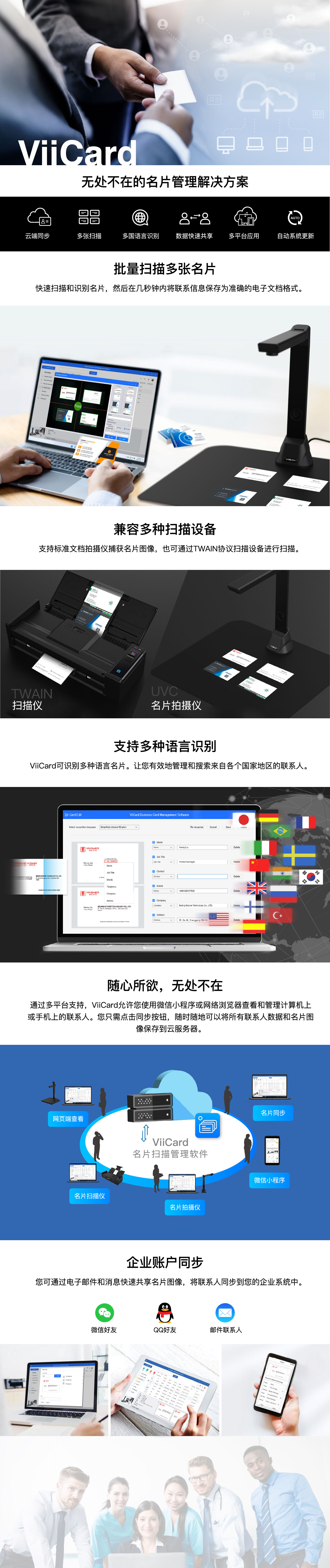 ViiCard是(shì)一(yī)款為(wèi)中小(xiǎo)企業(yè)提供的(de)安全名片管理(lǐ)軟件(jiàn),•可(kě)精準辨識中、英、日(rì)、韓、法、德、義…等130種語系。讓團隊成員(yuán)輕松将名片數(shù)字化(huγà)建檔,快(kuài)速掃描及儲存名片資訊至雲端,可(kě)兼容USB拍(pāi)攝儀、TWAIN驅動平台掃描儀、微(wēi)信小(xiǎo)程序α等等,并同步到(dào)伺服器(qì)集中管理(lǐ)與應用(yòng),随時(shí)随地(dì)共享聯絡人(rén)資訊。
