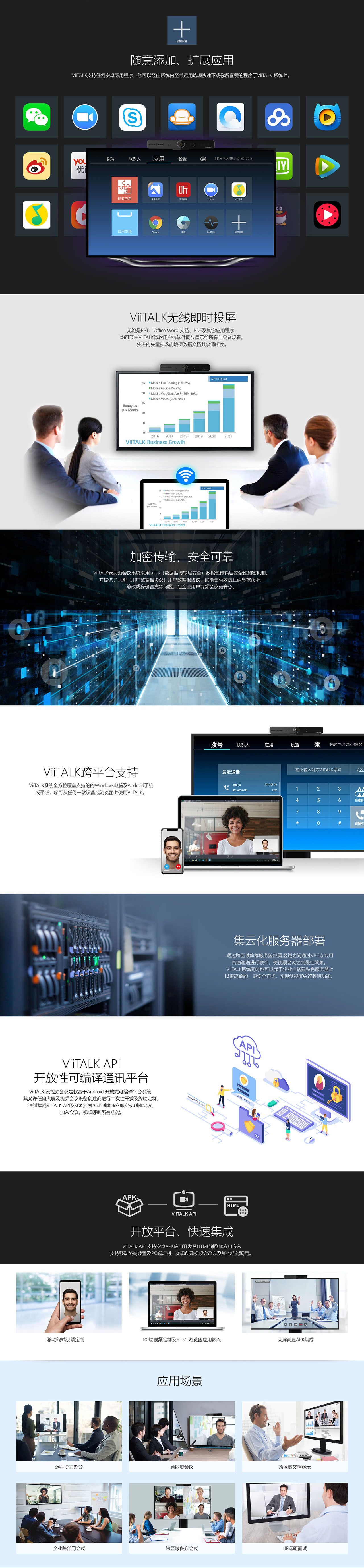 ViiTALK雲視(shì)頻(pín)會(huì)議(yì)是(shì)一(yī)款基于開(kāi)發式可(kě)編譯平台的(de)會(huì)議(yì)系統。 V©iiTALK 雲端視(shì)訊會(huì)議(yì)的(de)誕生(shēng),打破了(le)舊(jiù)時(shí)對(duì)"視(shì)訊會(huì)議∏(yì)"的(de)印象,讓視(shì)訊會(huì)議(yì)不(bù)再是(shì)昂貴又(yòu)高(gāo)不(bù)可(kě)攀的(de)服務。 結合"移動β化(huà)+雲端"的(de)特性, 使用(yòng)者為(wèi)中心的(de)開(kāi)發與設計(jì),ViiTALK 不(bù)被局限于硬件(ji®àn)型系統,亦無需專業(yè)工(gōng)程人(rén)員(yuán)的(de)安裝設定,即使在移動端也(yě)能(néng)輕松使用(yòng),一(yī)安裝便上(shàng)手©! 若要(yào)了(le)解更多(duō)有(yǒu)關ViiTALK 軟件(jiàn)服務等相(xiàng)關細節,煩請(qǐng)訪問(wèn)ViiTALK 專屬官網 www.viitalk.com