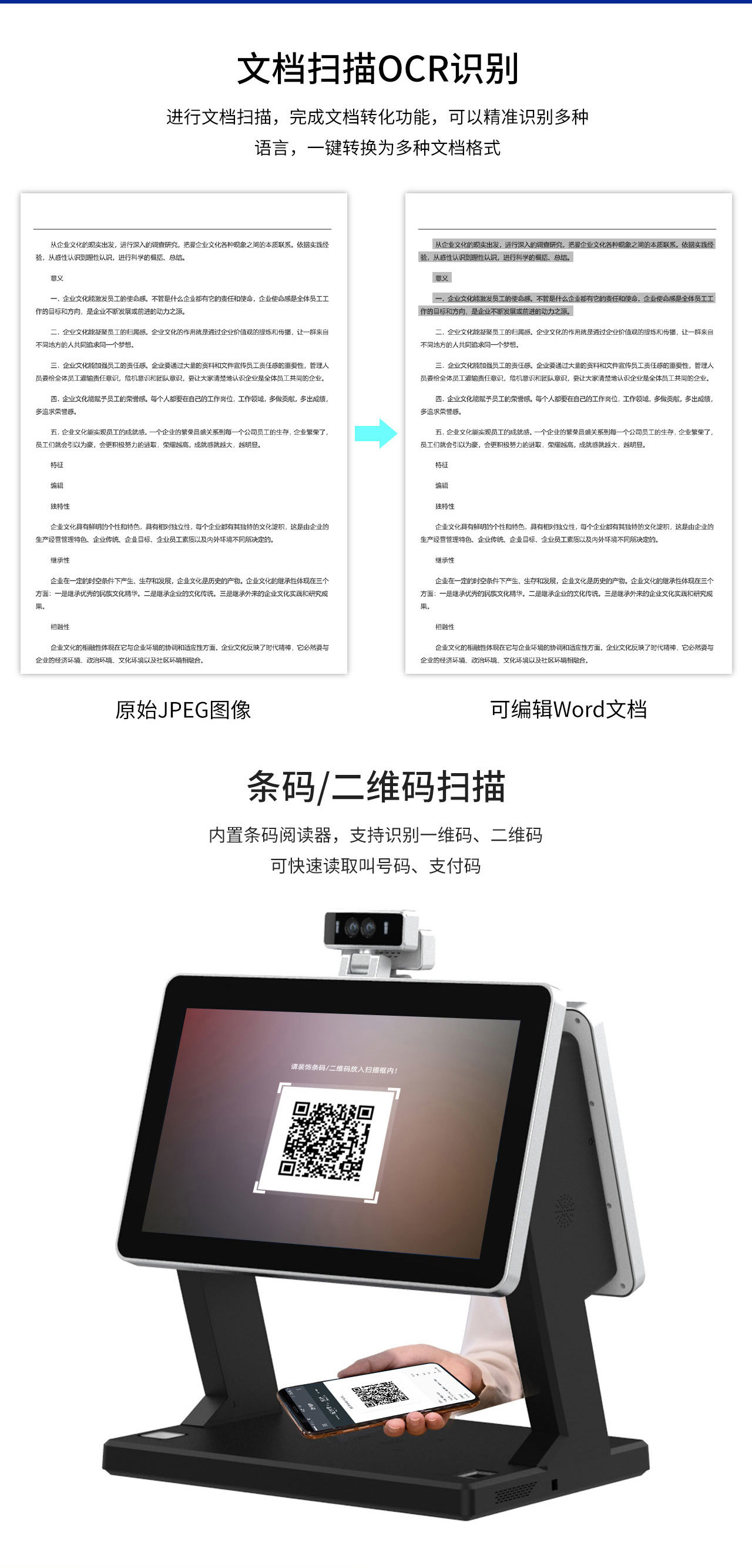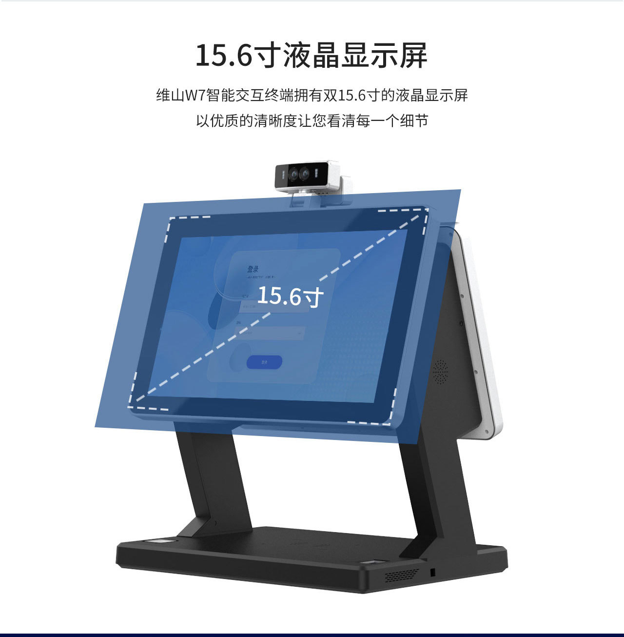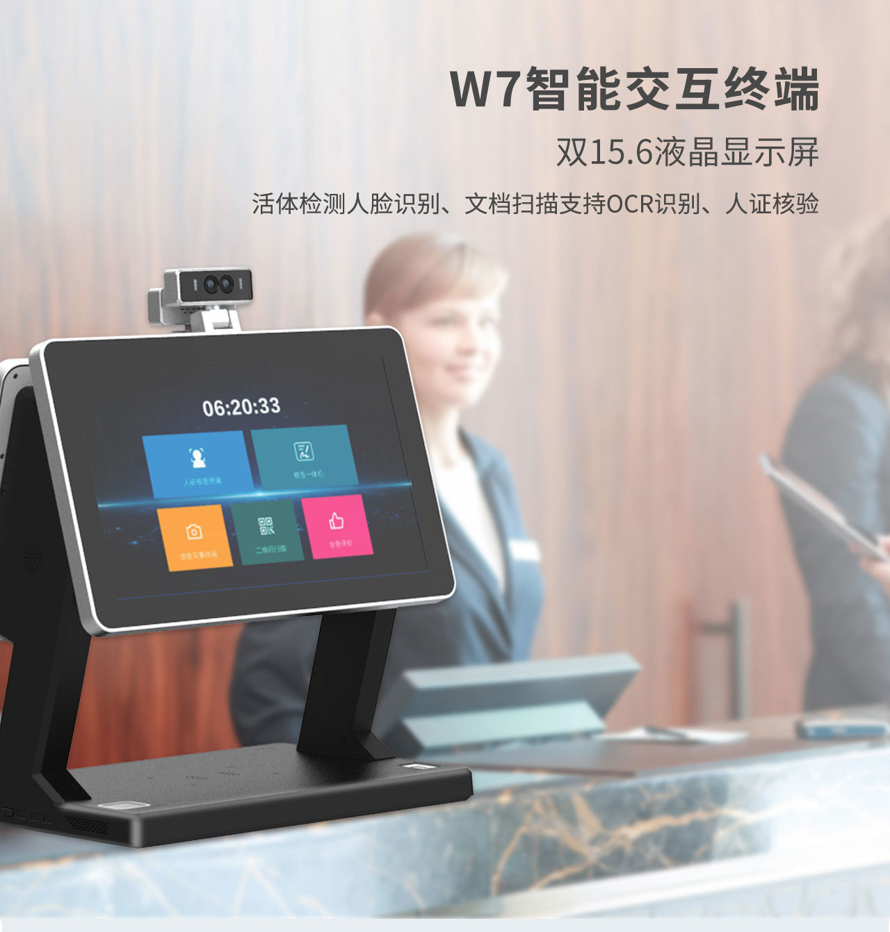 W7智能(néng)交互終端支持雙屏智能(néng)辦公、支持多(duō)應用(yòng)領域,擁有(y∞ǒu)15.6寸液晶顯示屏,支持顯示屏觸摸、手寫簽名;200萬雙目活體(tǐ)攝像頭支持活體(tǐ)檢測人(ré&n)臉識别、人(rén)證核驗;800萬像素文(wén)檔攝像頭可(kě)進行(xíng)文(wén)檔掃描并進行(xín&g)OCR識别、支持條碼/二維碼掃碼;支持指紋記錄、識别;支持二代證、IC電(diàn)子(zǐ)讀(dú)卡