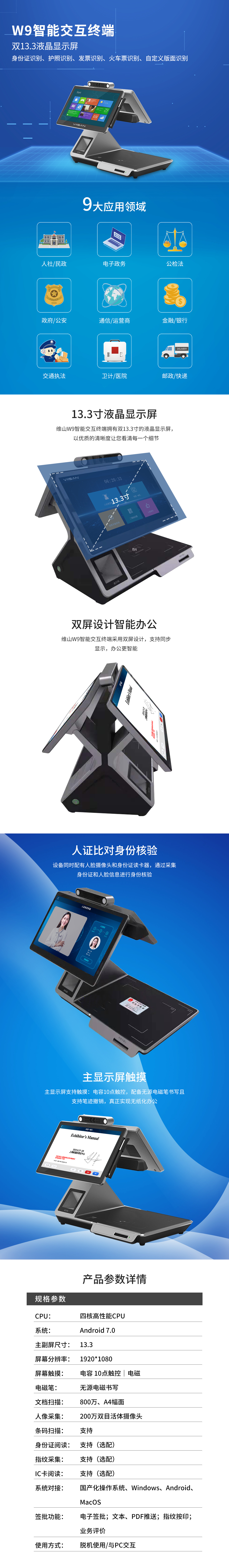 本産品擁有(yǒu)雙13.3寸液晶顯示屏,1300萬像素、A4标準幅面文(wén)檔攝像頭、200萬像素雙目活體(tǐ)攝像頭,支持身(shēn)份證識别、護照(zhào)識别、發票(piào)識Ω别、火(huǒ)車(chē)票(piào)識别、自(zì)定義版面識别;支持國(guó)産化(huà)系統、二次開(kāi)發。