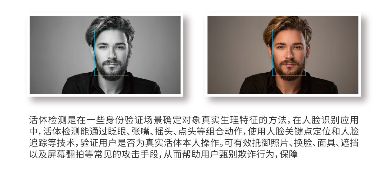 • 紅(hóng)外(wài)雙目檢測技(jì)術(shù)能(néng)夠同時(shí)實時(shí)采集近(jìn)紅(hóng)外(wài)和(hé)可(kě)見 (jiàn)光(guāng)兩種圖像,用(yòng)于檢測是(shì)否為(wèi)真人(rén)。∑