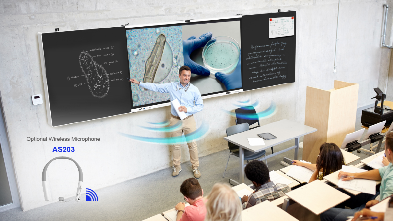 支持與無線麥克風(fēng)即刻配對(duì),為(wèi)教師(shī)與演講者提供清晰出色的(de)語音(yīn)傳輸效果。