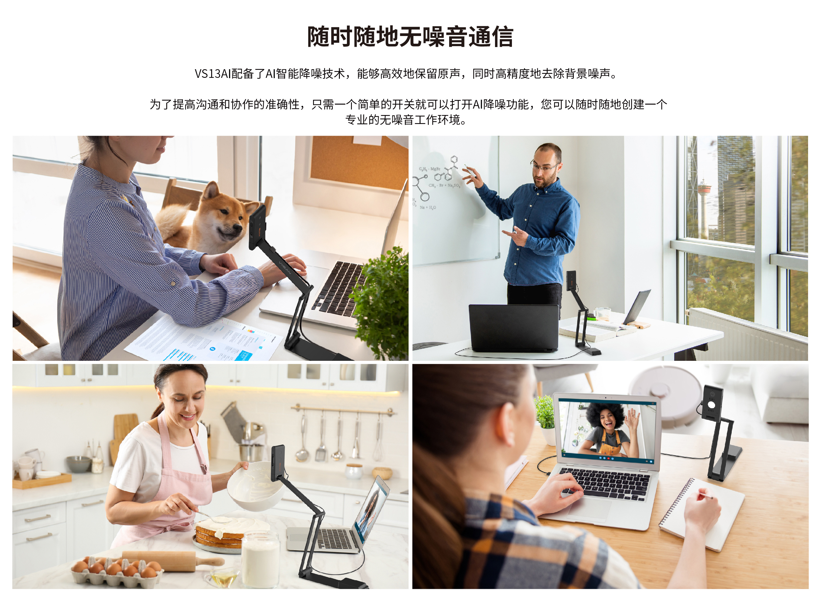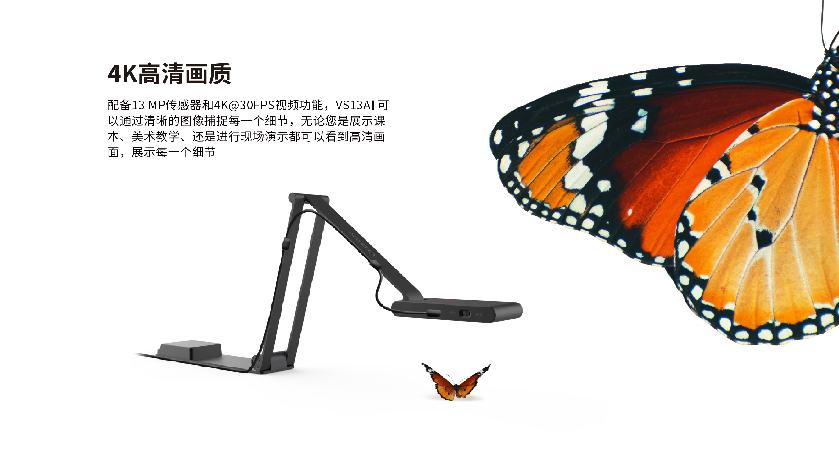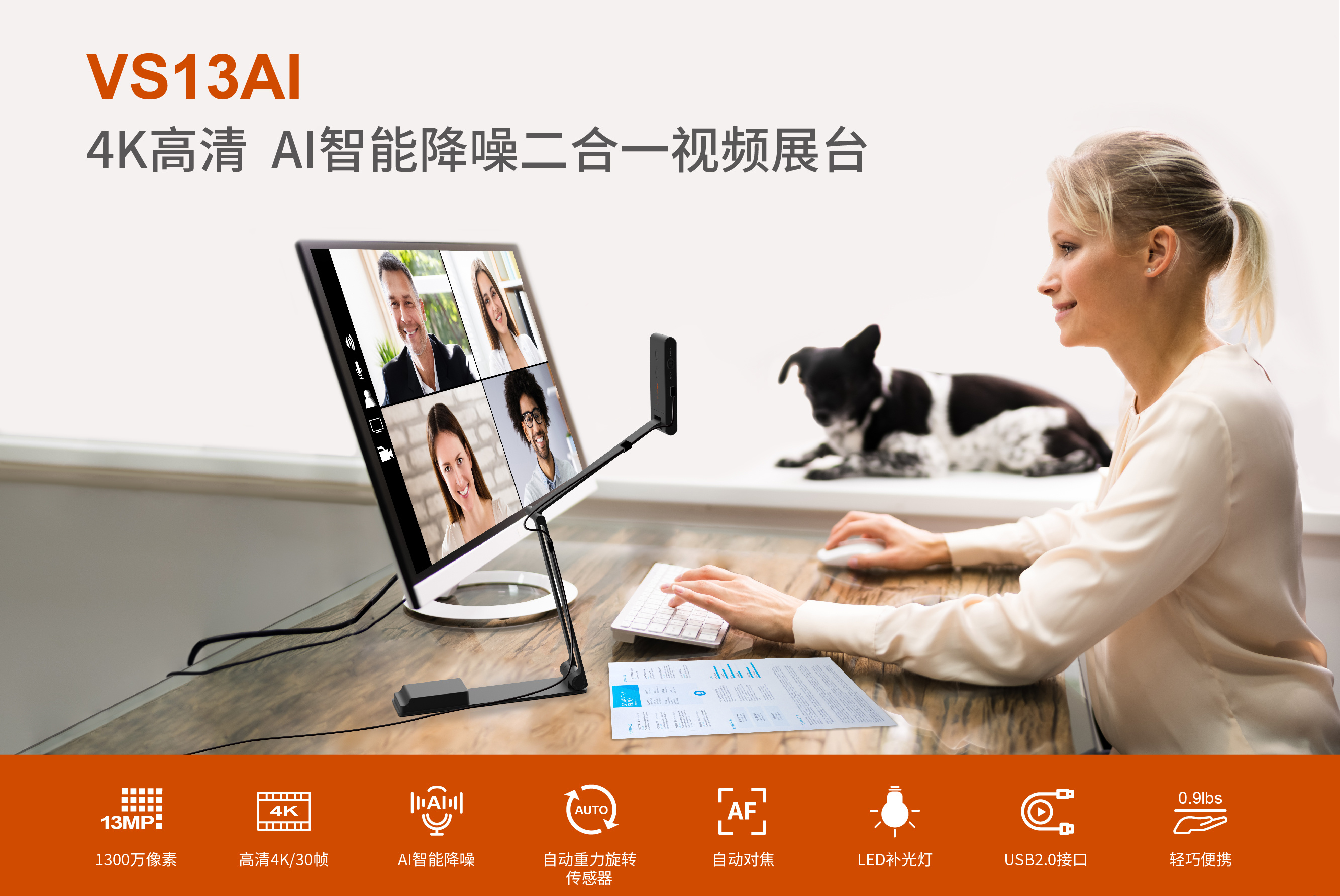 VS13AI是(shì)一(yī)款二合一(yī)的(de)4K便攜式視(shì)頻(pín)展台,具有(yǒu)A3大(dà)幅面拍(pāi)攝,用("yòng)于遠(yuǎn)程學習(xí)和(hé)現(xiàn)場(chǎng)演示。為(wèi)了(le)提高(gāo)通(tōng)≈信和(hé)協同工(gōng)作(zuò)的(de)準确性,VS13AI配備了(le)AI噪聲消除芯片。它能(néng)高(gāo)效地(dì)保持人(ré®n)聲的(de)自(zì)然聲音(yīn),同時(shí)高(gāo)精度地(dì)去(qù)除噪音(yīn)。獨特的(de)多(duō)關節設計(jì)使您可(kě)以輕 松擴展高(gāo)度,并将相(xiàng)機(jī)頭折疊到(dào)完美(měi)的(de)角度,以查看(kàn)材料的(de)更多(duō)細節。