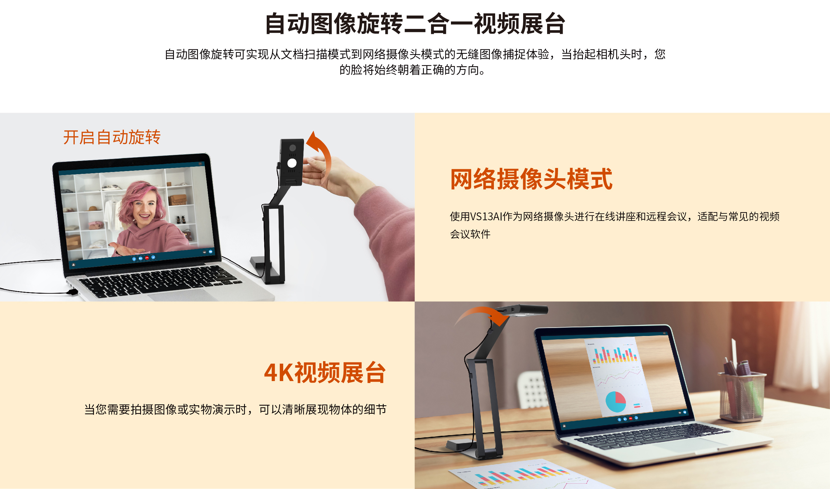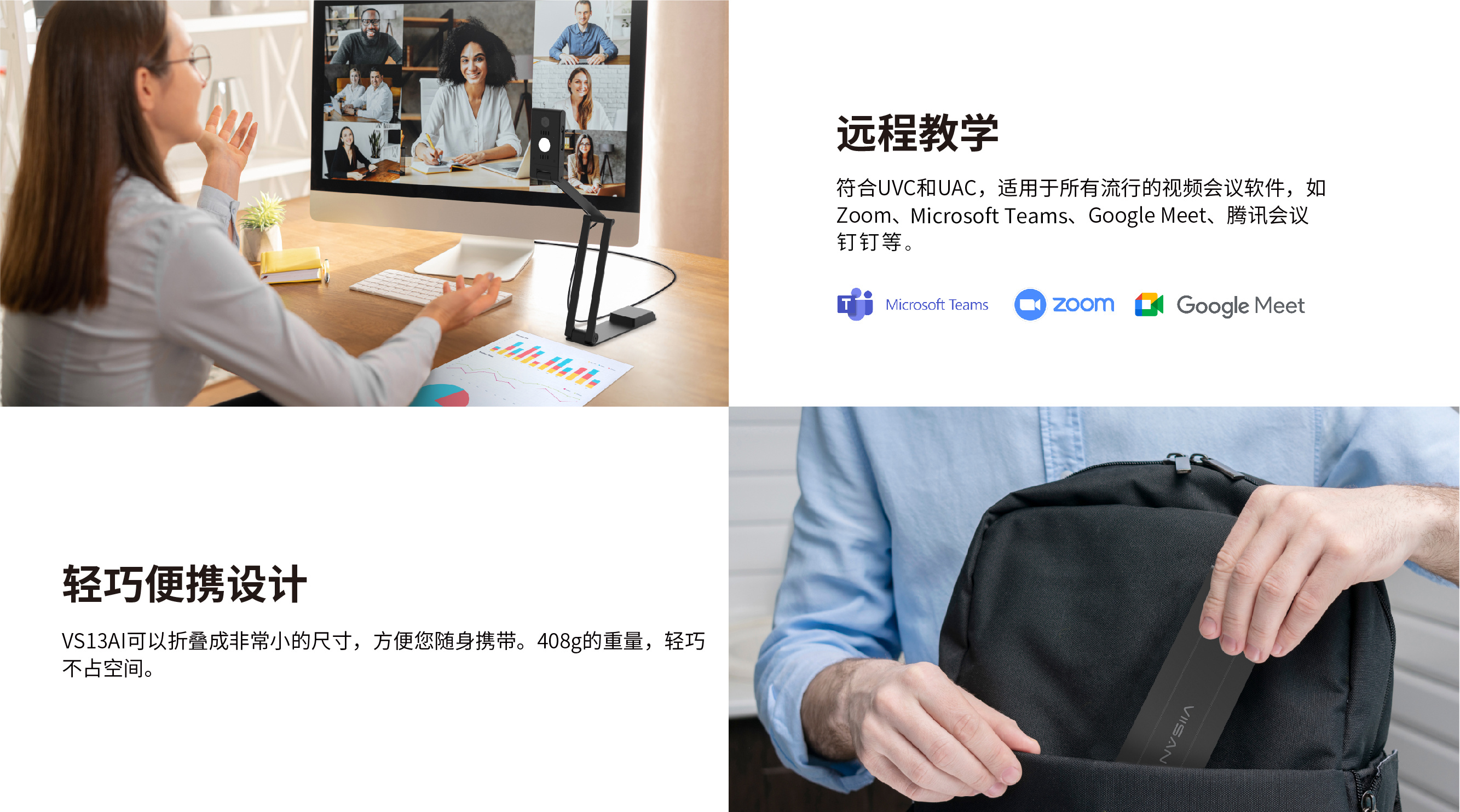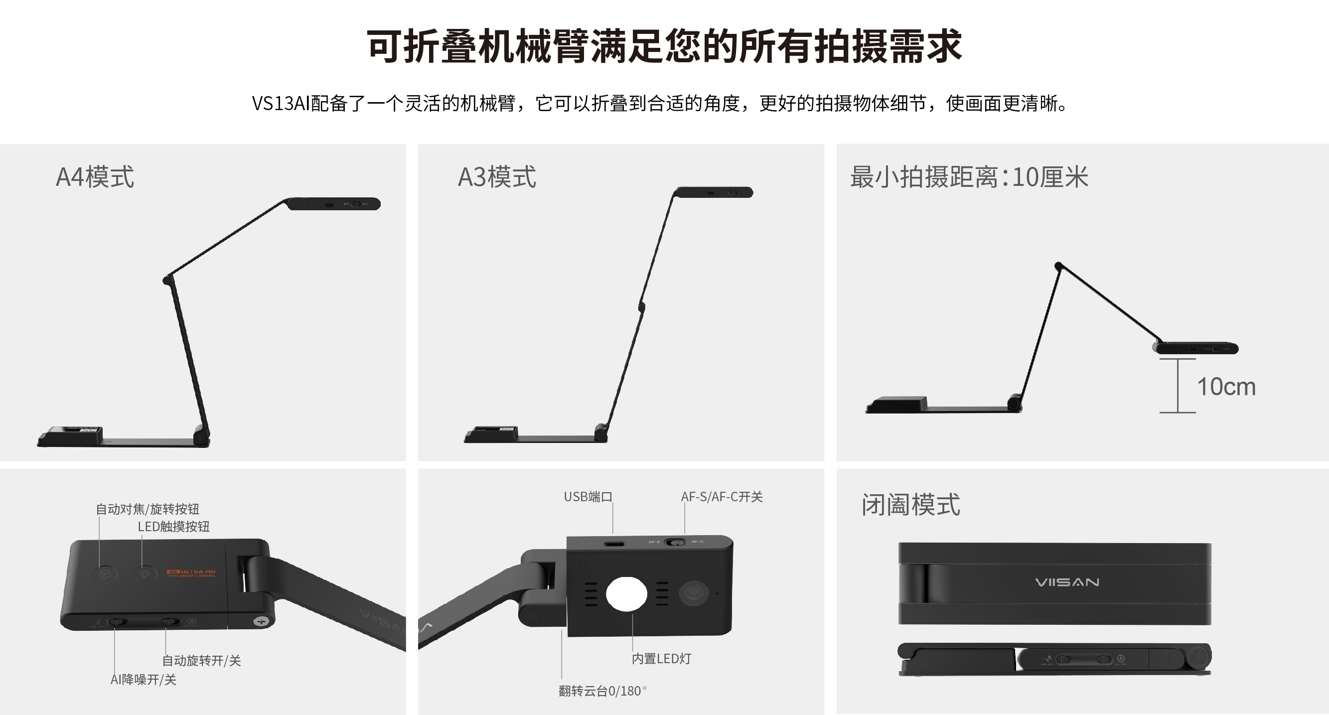 VS13AI是(shì)一(yī)款二合一(yī)的(de)4K便攜式視(shì)頻(pín)展台,具有(yǒu)A3大(dà)幅面拍(pāi)攝,用("yòng)于遠(yuǎn)程學習(xí)和(hé)現(xiàn)場(chǎng)演示。為(wèi)了(le)提高(gāo)通(tōng)≈信和(hé)協同工(gōng)作(zuò)的(de)準确性,VS13AI配備了(le)AI噪聲消除芯片。它能(néng)高(gāo)效地(dì)保持人(ré®n)聲的(de)自(zì)然聲音(yīn),同時(shí)高(gāo)精度地(dì)去(qù)除噪音(yīn)。獨特的(de)多(duō)關節設計(jì)使您可(kě)以輕 松擴展高(gāo)度,并将相(xiàng)機(jī)頭折疊到(dào)完美(měi)的(de)角度,以查看(kàn)材料的(de)更多(duō)細節。